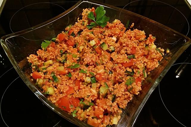 1. Das Wasser zum Kochen bringen und in einer hitzebeständigen Schüssel über den Bulgur geben. Für 15 Minuten zugedeckt quellen lassen.